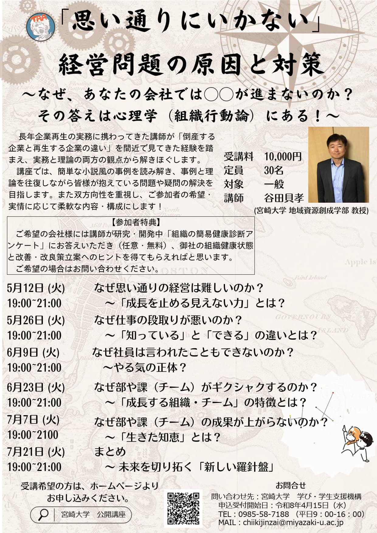 本講座では、企業再生の実務経験を持つ宮崎大学の谷田貝孝教授を講師に迎え、理論と実例を往復しながら、組織の「見えない構造的な原因」を解明していきます。